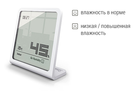Еще один приятный бонус Selina – визуальный «Анализ влажности»: если влажность в норме (40–60%), смайлик улыбается, а если слишком низкая (<40%) или высокая (>60%) – грустит. При этом диапазон измерения влажности и температуры у Selina очень широкий: от 10% до 98% и от -10°С до +50°С, соответственно. То есть использовать этот прибор можно практически в любом помещении, за исключением лабораторий с экстремальными условиями***.